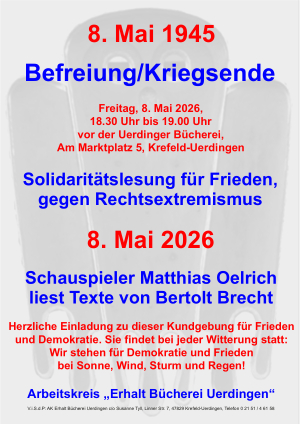 Anlässlich des 80. Jahrestages des Kriegsendes / des Tages der Befreiung veranstaltet der Arbeitskreis „Erhalt Bücherei Uerdingen“ am, Donnerstag, dem 8. Mai 2025 von 18.30 Uhr bis 19.00 Uhr, Am Marktplatz 5, 47829 Krefeld-Uerdingen, eine Solidaritätslesung als Demonstration für Frieden und Demokratie.